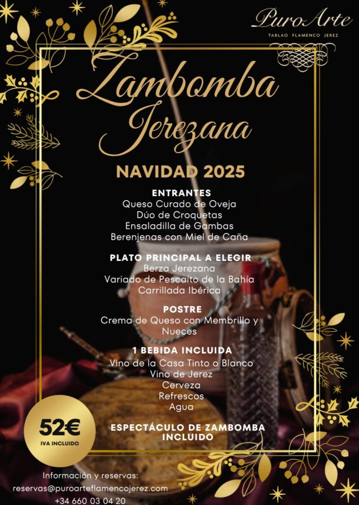 La ya tradicional Zambomba Jerezana de Puro Arte se desarrolla por la tarde o por la noche. El coste de la entrada incluye la degustación de un menú especial, rodeado de grandes artistas, en un ambiente festivo en el que la Navidad y el Flamenco se funden en uno haciendo la delicia de todos los presentes.
